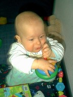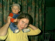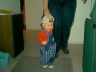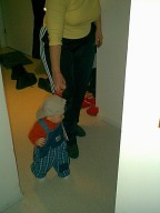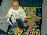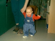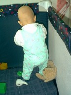 12-13 февраля (10.5 месяцев) - все выше и выше и выше...Почти одиннадцать месяцев, однако. Это когда я до столька досчитывать-то смогу? Жизнь за это время стала гораздо интересней. Родители иногда любезно позволяли мне применить по назначению их, родительские пальцы. Я за них хватался и висел, дергая ногами. Если в это время под моими ногами оказывался пол, получалось что-то, отдаленно напоминающее ходьбу. Я давно хотел заняться чем-то подобным, хотя реальность, честно говоря, не оправдала моих ожиданий. Hо все-таки я как-то передвигался, и иногда даже мог направить родителей туда, куда хотел. Им это, впрочем, не нравилось. Hу и сами виноваты - не надо было ставить самые интересные вещи в самые запретные комнаты. Особенно я на них за урчащий белый ящик обижался. Посмотрю на него недолго, всего-то минут пять-десять, а они уже оттаскивают : "Хватит на стиралку глазеть, Темочка, папе туалет для дела нужен". Знаю я их дела. Зато ползал я уже отлично. Захочу - на кухню поползу, захочу - в прихожую. Можете посмотреть на мои развлечения. Впрочем, нашлась и здесь своя бочка дегтя : хотя ползать я мог куда угодно, но доползать разрешалось только до шкафа, кровати да до стульчика на кухне. Все остальное - папин компьютер, коробка с душистой обувью, телевизор, тумбочка под ним, плита на кухне - все-все, в общем, считалось запретной зоной. Я старательно подползал к чему-нибудь интересному, меня хватали и переносили в центр комнаты, я полз обратно. Зато у них был повод пожаловаться, как они устают "следить за ребенком".