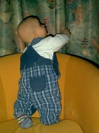 Зато ползал я уже отлично. Захочу - на кухню поползу, захочу - в прихожую. Можете посмотреть на мои развлечения. Впрочем, нашлась и здесь своя бочка дегтя : хотя ползать я мог куда угодно, но доползать разрешалось только до шкафа, кровати да до стульчика на кухне. Все остальное - папин компьютер, коробка с душистой обувью, телевизор, тумбочка под ним, плита на кухне - все-все, в общем, считалось запретной зоной. Я старательно подползал к чему-нибудь интересному, меня хватали и переносили в центр комнаты, я полз обратно. Зато у них был повод пожаловаться, как они устают "следить за ребенком".