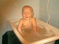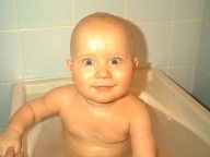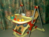 Золотое времечко было, между прочим. Больше, наверное, уже и не будет такого. Эх, молодость... После тех фотографий вверху прошел всего один месяц - а до меня вдруг столько нового дошло! Во-первых, я лично изобрел метод вертикального подъема (надо запатентовать) - хватаешь за пальцы кого-нибудь, скажем, папу и тянешься. Не верите? Попробуйте. Папа вот тоже попробовал, но ничего не поднял, а наоборот - маму на кровать уронил. Еще я наконец-то познакомился с единственным приличным человеком в нашем доме, он в зеркале живет. Я с ним до сих пор болтаю, иногда можем беседовать по полчаса. Только на ощупь он какой-то странный, ну да ладно, вон папа, он вообще колючий, но жить с ним вполне можно. Да, и главное - я стал игрушки хватать. Родители по этому поводу очень радовались, хотя почему-то постоянно у меня отнимали законную добычу. Самое обидное, отнимали самое интересное, новенькое, а старое и потрепанное почему-то оставляли. И зайцев над кроватью повесили так, что никак не достать было. А потом удивлялись, чего это я "нужу". Так обеспокоились, что решили вместо мамы мне подсунуть ложку, полную сильнопахнущей жижи. Детское питание! Сами-то в рот подобного не возьмут! Я, честно говоря, поначалу обрадовался, схватил ложку, стал махать... Но потом-то я им показал!